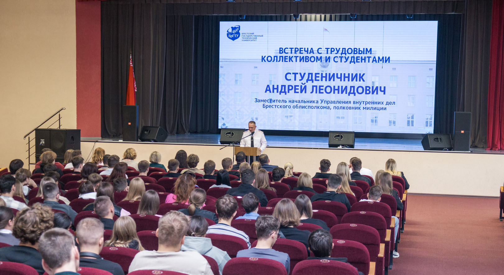 A meeting between employees and students and law enforcement representatives was held at Brest State Technical University. The event was opened by Andrei Nikolaevich Parfievich, Vice Rector for Academic Affairs at Brest State Technical University.