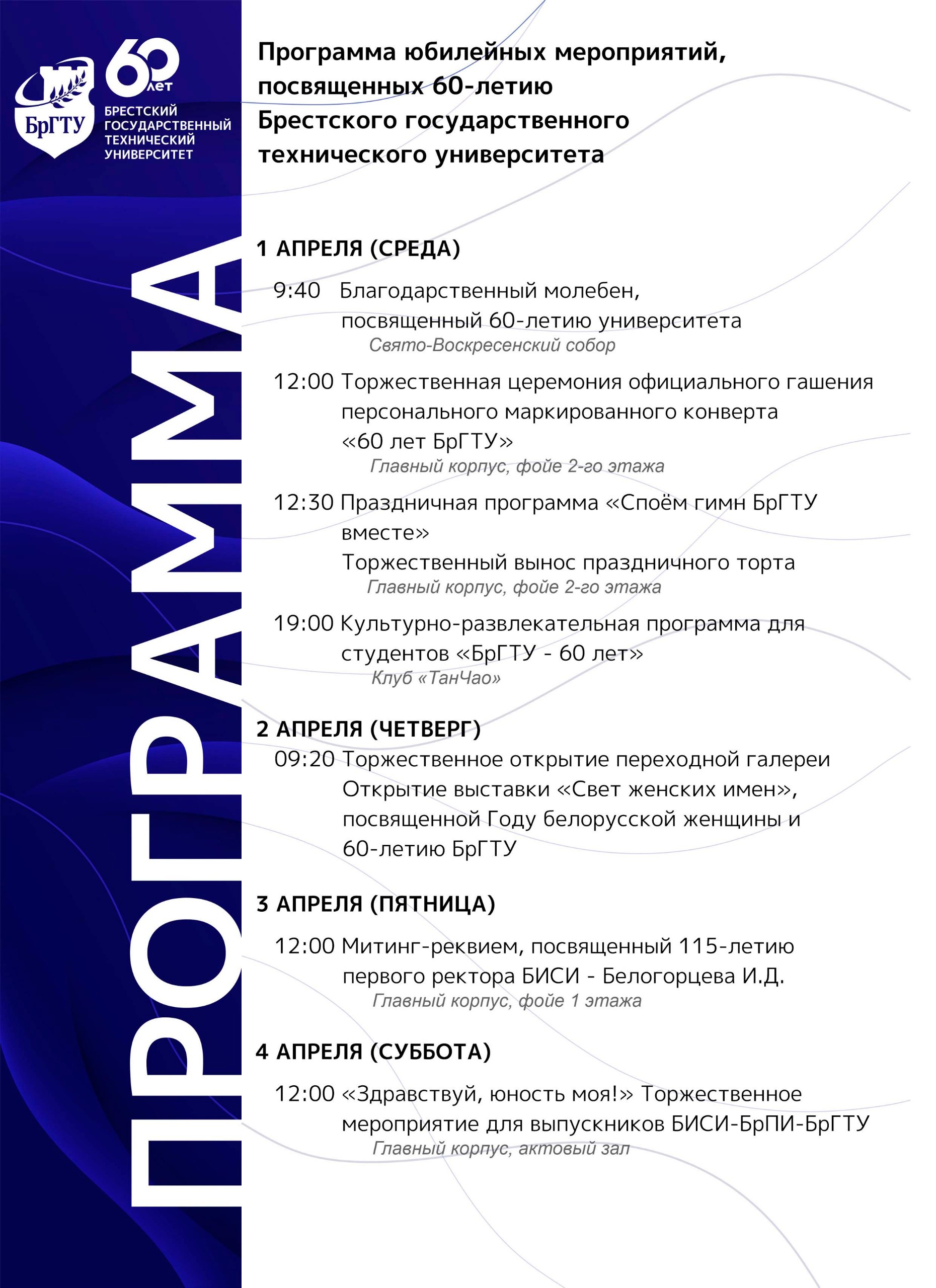 В этом году БрГТУ отмечает свой 60-летний юбилей — значимую дату в истории нашего вуза. Мы подготовили для вас насыщенную программу, которая объединит поколения, подарит яркие эмоции и оставит незабываемые воспоминания!